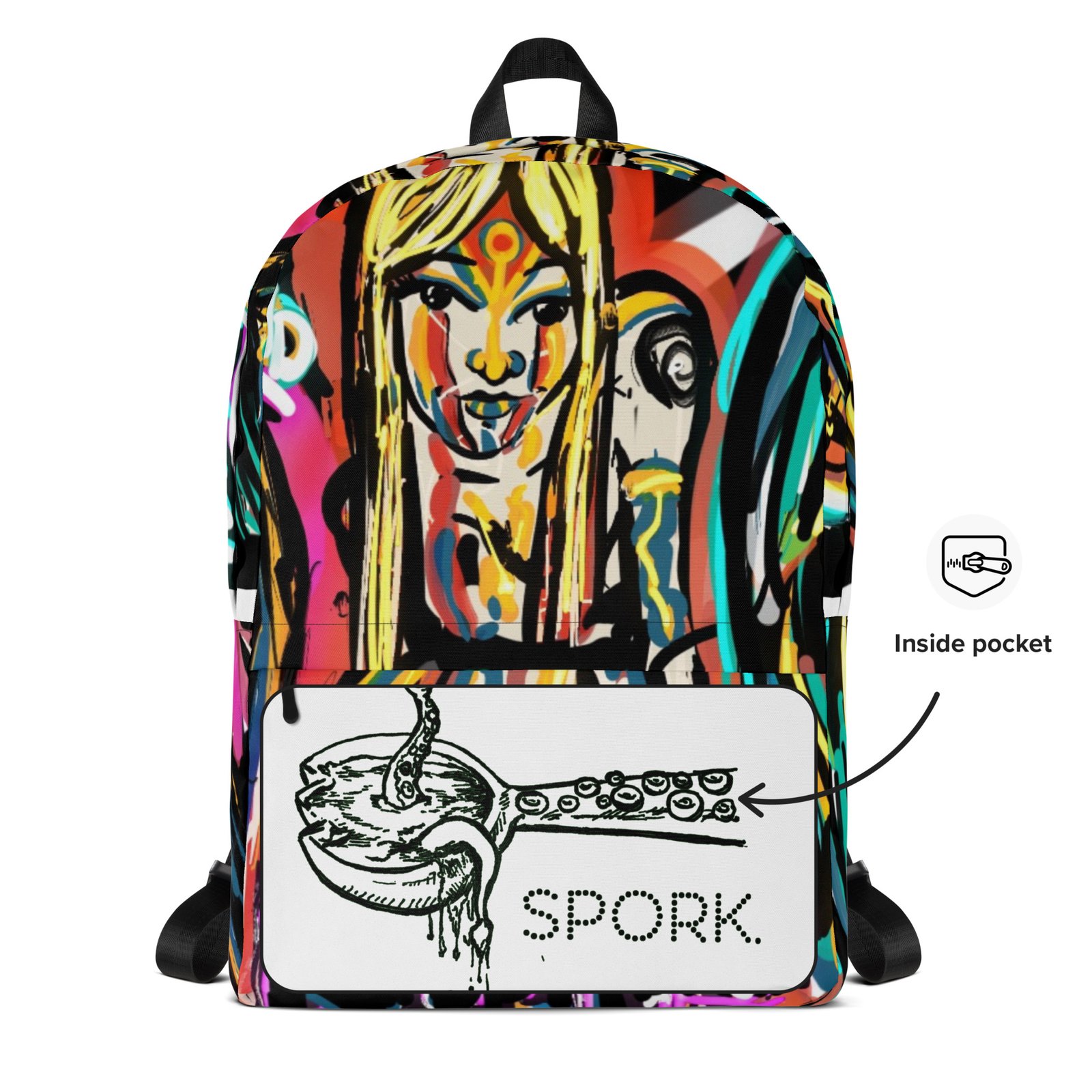 This medium size Down the Rabbit Hole backpack is just what you need for daily use or sports activities! The pockets (including one for your laptop) give plenty of room for all your necessities, while the water-resistant material will protect them from the weather. Spork life for life!